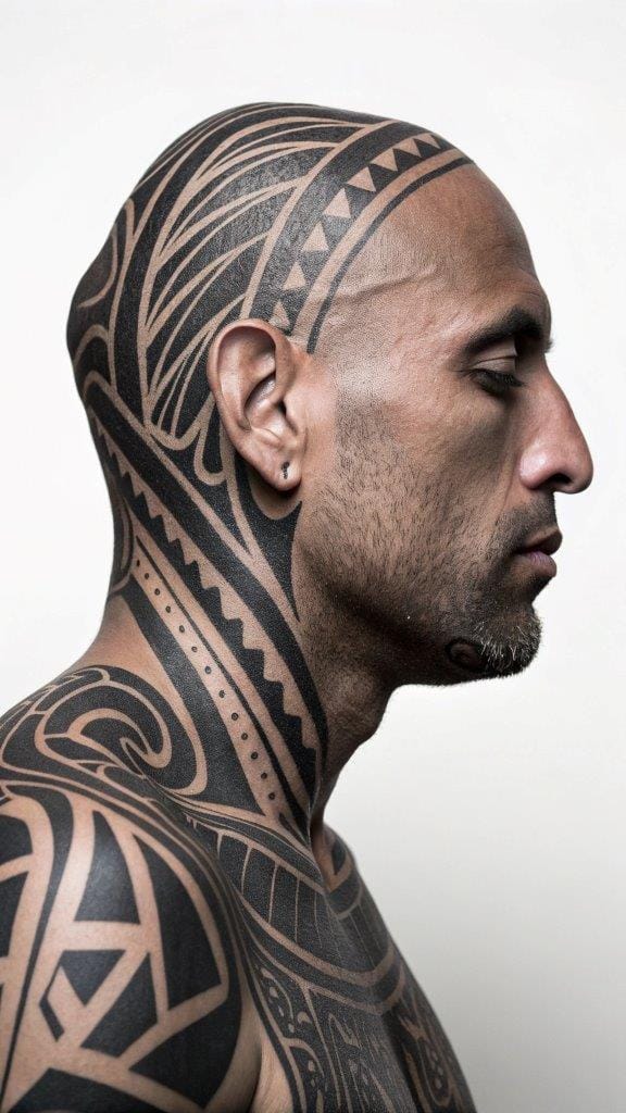 Tribal tattoos have always been a symbol of strength and heritage, and when placed on the head, they exude a majestic presence. These designs often feature bold lines and intricate patterns that wrap around the scalp, creating a powerful visual impact. Ideal for those who want to pay homage to their ancestry or simply love the boldness of tribal art.