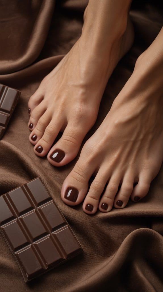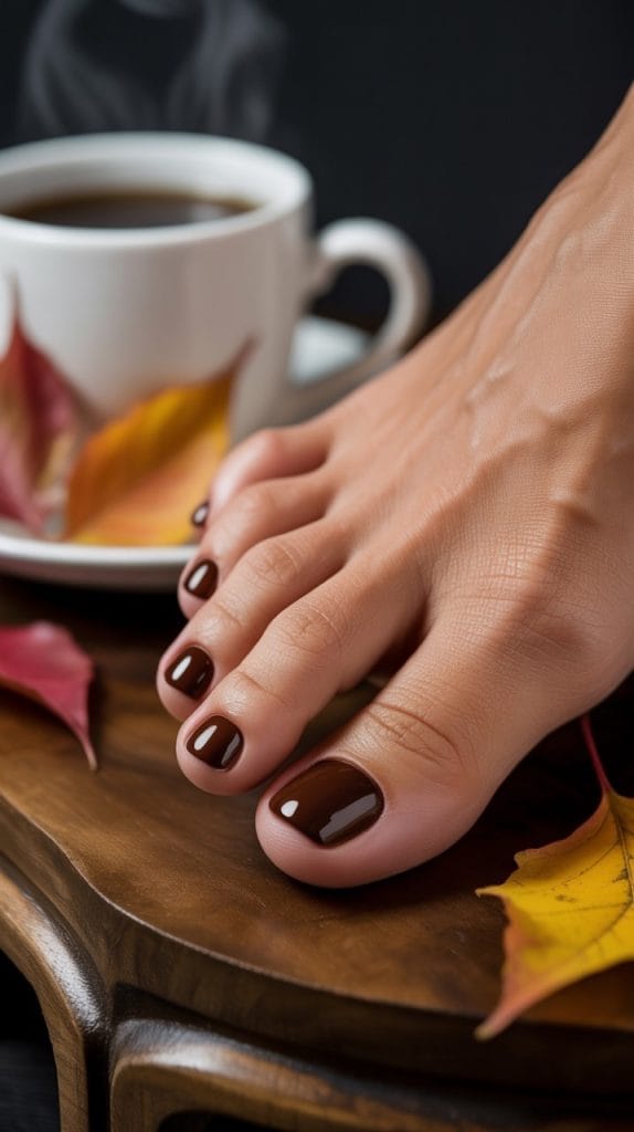 Indulge in the richness of chocolate truffle brown for a decadent pedicure. This deep, luscious shade is perfect for those who love the darker side of fall colors. It’s a luxurious choice that pairs beautifully with cozy knits and elegant evening wear.