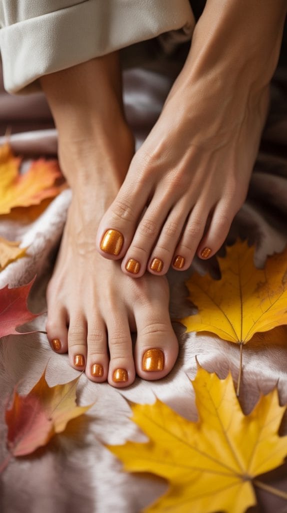 Embrace the golden hues of autumn with a golden amber brown pedicure. This shade captures the brilliance of fallen leaves and the warmth of the autumn sun. It’s perfect for adding a touch of glamour to your feet, making it a great choice for both daytime outings and evening events.