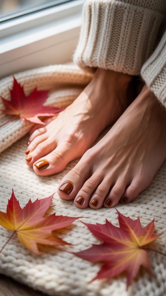 Imagine wrapping your hands around a steaming cup of cocoa; now imagine that comforting color on your toes. A warm cocoa brown pedicure brings the essence of comfort to your feet. This shade pairs beautifully with cozy sweaters and chunky scarves, making it a must-have for your fall nail palette. Its understated elegance makes it versatile for both casual and formal outings.