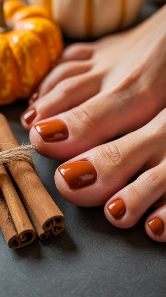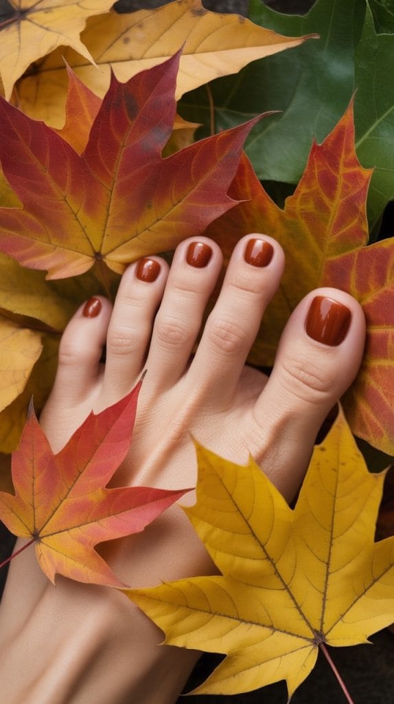 Burnt sienna is a classic autumn color, offering a deep, reddish-brown hue that’s both bold and beautiful. This shade is perfect for those who want to make a statement with their pedicure while embracing the warm tones of fall. It’s a great choice for both day and night looks.