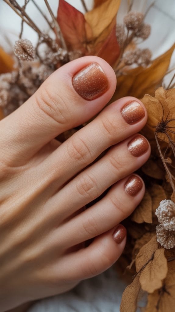 Bronzed brown sugar offers a sweet and warm hue that’s perfect for capturing the essence of fall. This shimmering shade adds a touch of glamour to your pedicure, making it perfect for both casual outings and special occasions. It’s a beautiful way to embrace the golden tones of the season.