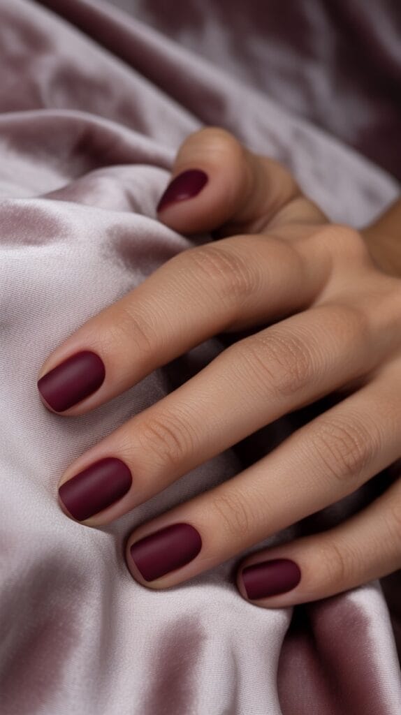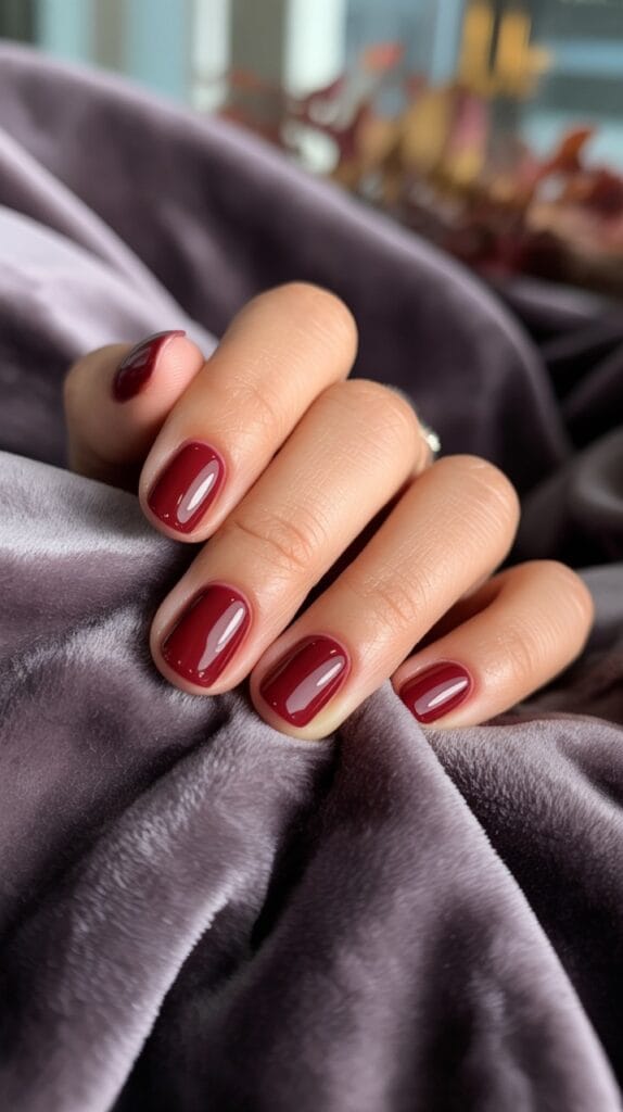 Wine-soaked velvet nails are both rich in color and texture, offering a luxurious option for the autumn season. This deep, saturated shade is perfect for those who want to make a statement. Add a velvet finish for an extra touch of opulence.