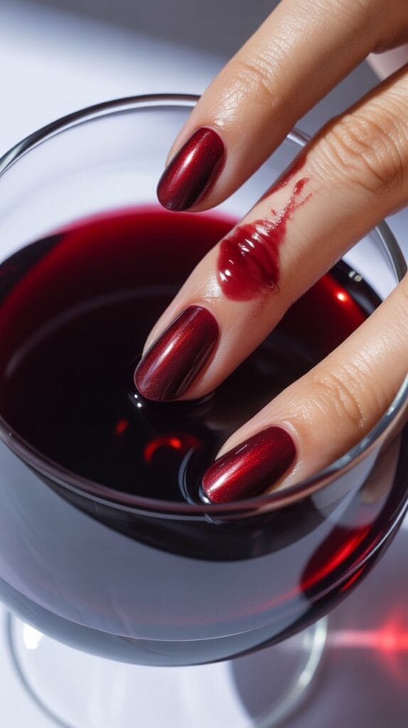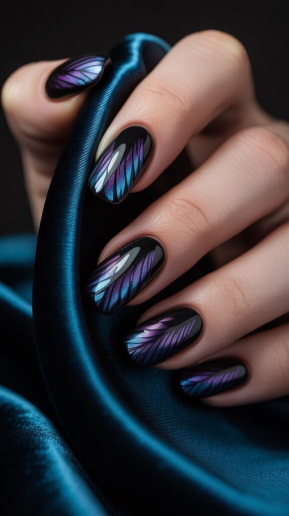 For a truly unique take on the vampy nail trend, try a raven’s wing design. This look features a black base with iridescent blue and purple accents, mimicking the sheen of raven feathers. Perfect for those who want to stand out.