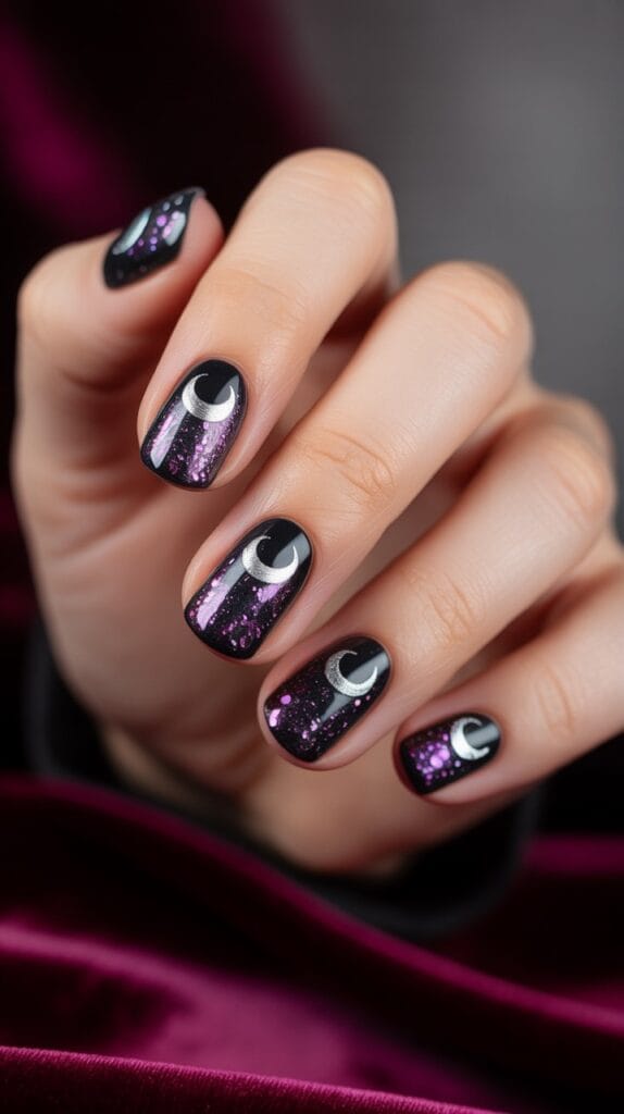 Add some sparkle to your vampy look with a gothic glitter design. Pair a dark base color with a glitter top coat that catches the light for an enchanting effect. This style is perfect for a night out or a festive fall gathering.