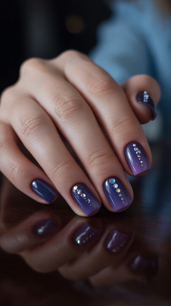 Create a gradient effect with a twilight ombre design that transitions from deep purple to midnight blue. This look captures the beauty of the evening sky and adds a touch of mystique to your nails. Try adding a few rhinestones for an extra touch of glamour.