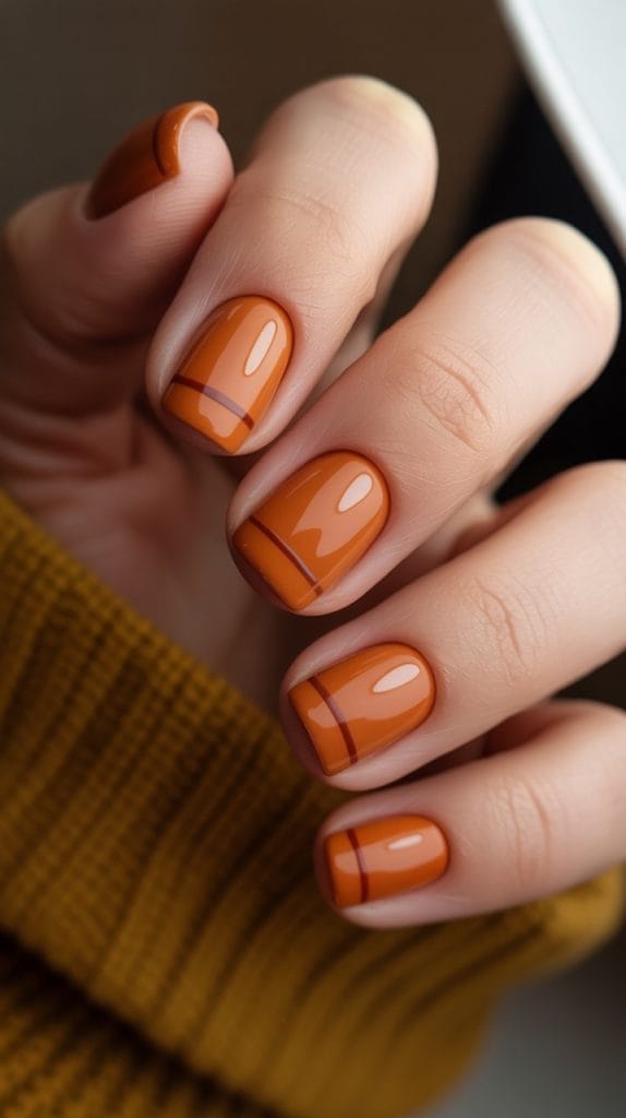 For those who prefer a more understated look, minimalist lines can add a sophisticated touch to short nails. Choose a neutral base and add thin lines in black, gold, or white for a sleek, modern design. This style is versatile and pairs well with any fall outfit.
