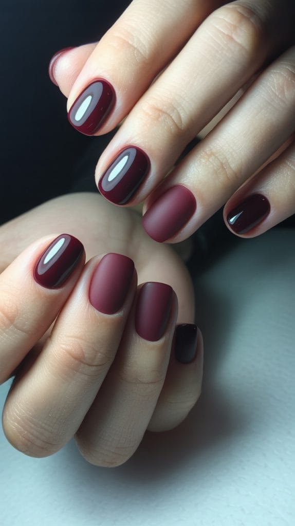 Moody maroons are a classic choice for fall. These deep, rich tones exude sophistication and pair beautifully with any outfit. For short nails, opt for a glossy finish to add depth and dimension. You can even accent one nail with a matte finish to create a subtle contrast.