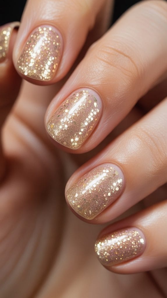 Add some sparkle to your fall look with golden glitter nails. This style works wonderfully on short nails, as glitter can make them appear longer and more glamorous. Apply a clear base and sprinkle fine golden glitter for a dazzling effect. It’s perfect for both everyday wear and special occasions.