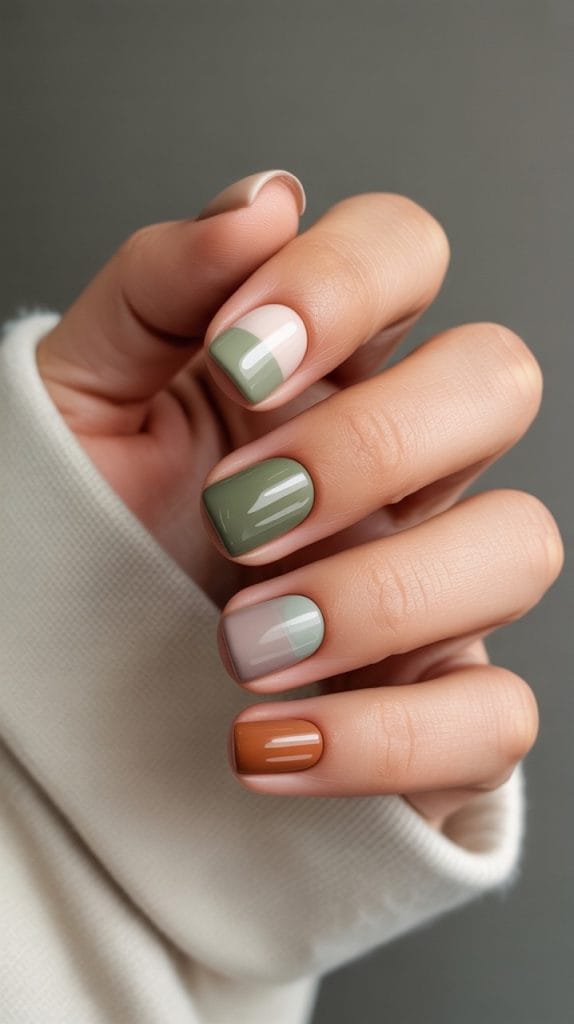 Earthy tones are synonymous with fall, offering a grounded, natural look. Colors like taupe, olive green, and burnt sienna can create a harmonious palette. For short nails, try a gradient effect or simple color blocking to showcase these beautiful hues.