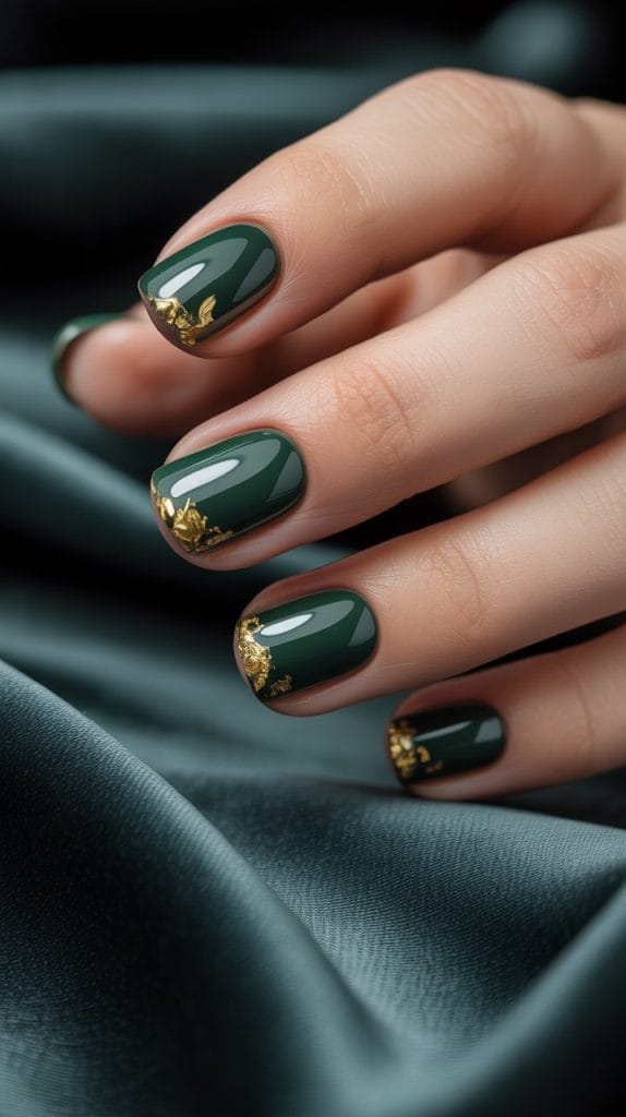 Dark forest green is a must-have shade for fall. It invokes the deep, lush tones of an autumn forest. For short nails, a simple, glossy finish can be elevated with a matte accent nail or tiny gold leaf details for a touch of luxury.