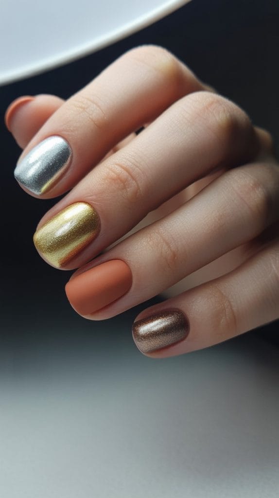 Metallic nails are a fun way to add a bit of magic to your fall look. Silver, gold, and bronze metallic shades work wonderfully on short nails, catching the light and adding dimension. Pair with a solid matte color for a trendy, eye-catching design.