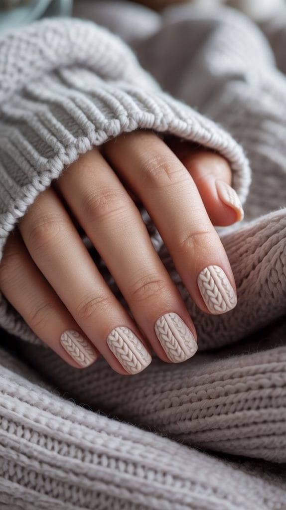 Bring the texture of your favorite fall sweater to your nails with this unique design. Use a 3D gel technique to create a cable-knit pattern on your short nails. Opt for cozy colors like beige, cream, or soft gray to complement the tactile design.
