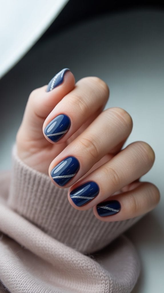Deep navy blues are a sophisticated choice for fall. This rich color can stand alone or be combined with silver or gold accents for a luxurious touch. For short nails, a glossy navy finish with metallic stripes or dots can add depth and interest.