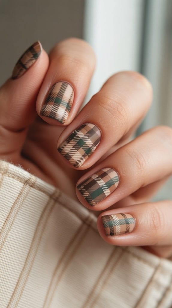 Plaid patterns are a staple in fall fashion, and they look just as good on nails. Use a mix of fall colors like burgundy, navy, and cream to create a cozy plaid design. This intricate pattern is perfect for short nails, adding a touch of seasonal charm.