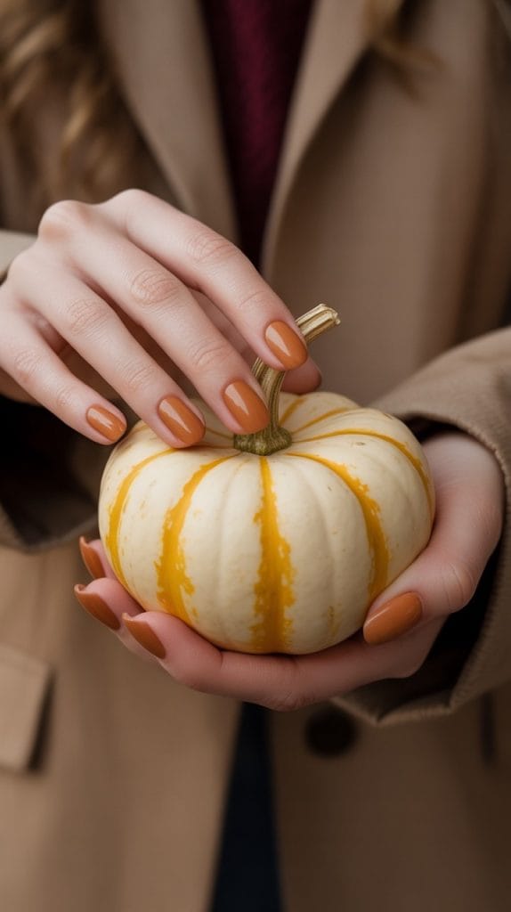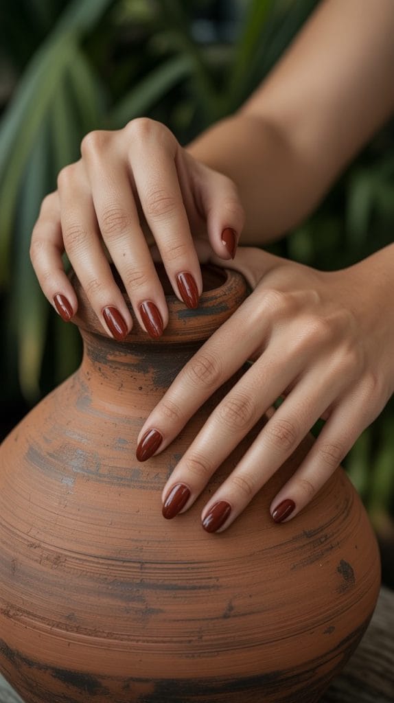 Terracotta nails offer an earthy and warm vibe that’s perfect for fall. This deep, reddish-brown shade is both bold and sophisticated, making it an ideal choice for those who want to embrace the season’s colors.