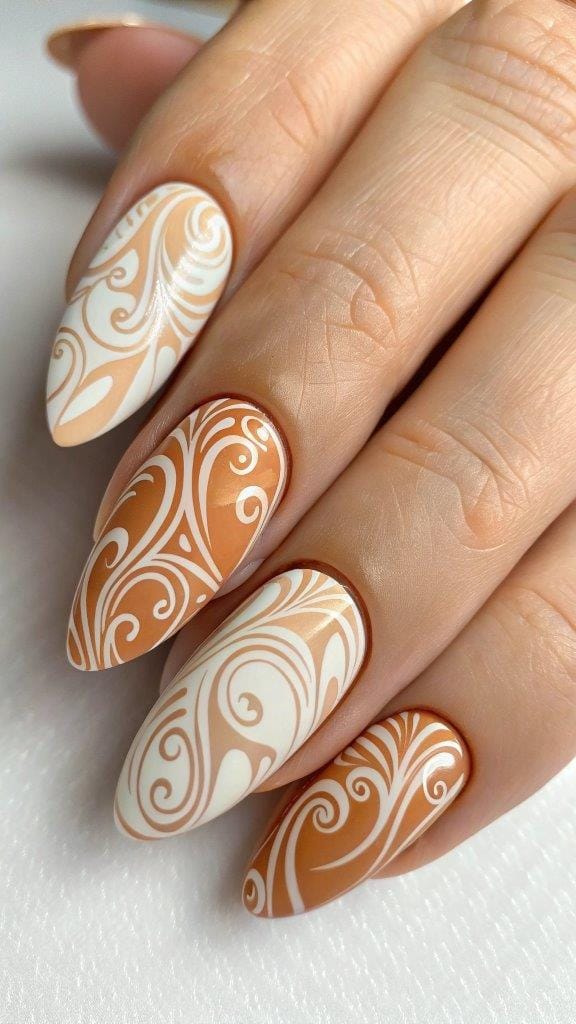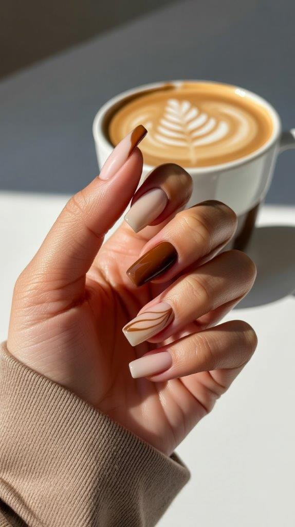 Mix caramel, beige, and espresso swirls for artsy fall nails that look like a Pinterest board.