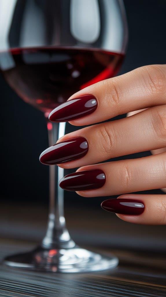 Burgundy nails never miss. Almond shape + glossy finish = instant “I have my life together” vibes (even if you’re currently living off instant noodles).