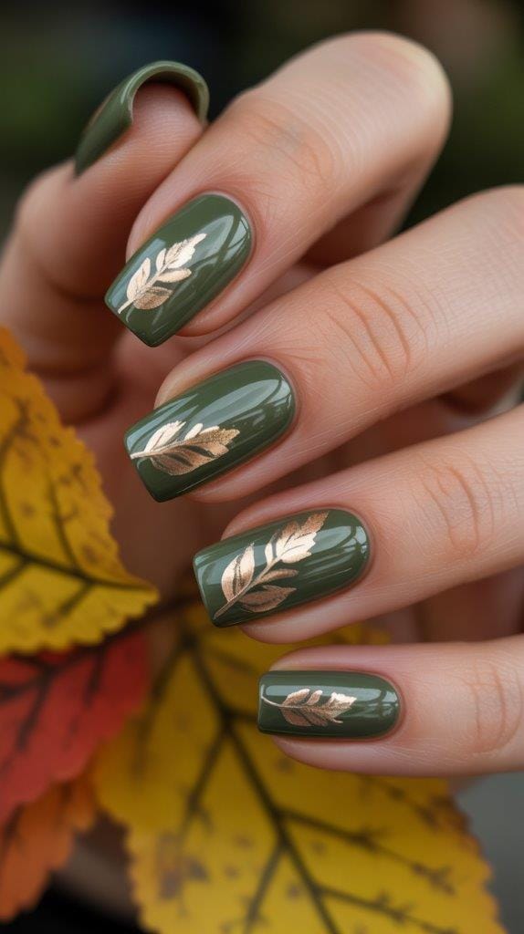 Not quite festive green, not too summery either. Olive green nails with gold accents are November in a manicure.