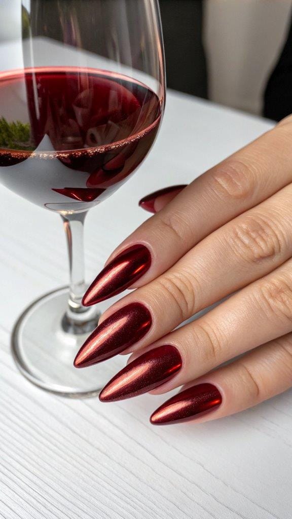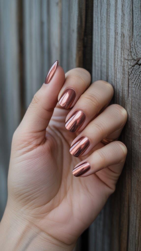 Chrome finishes are still trending, and copper chrome nails feel festive without going full tinsel-town.
