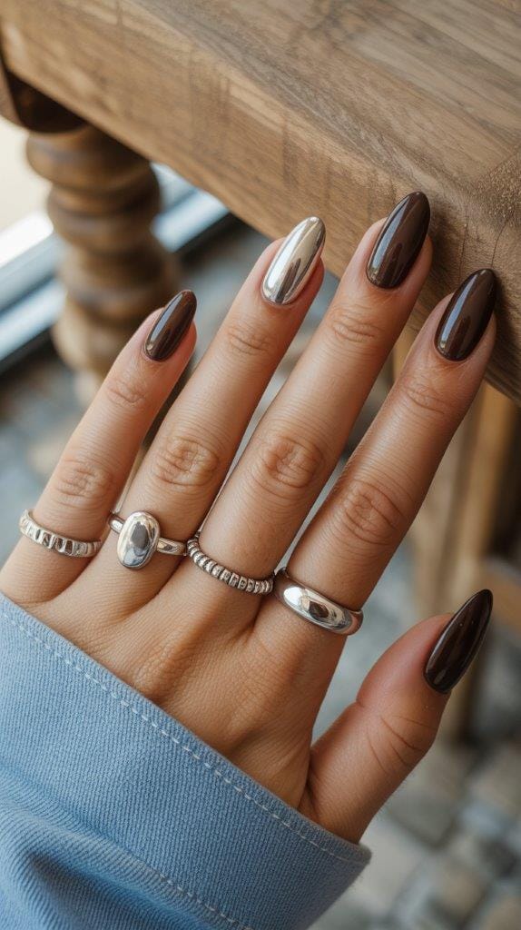 Go bold with espresso brown nails and add chrome accents on one or two fingers. Edgy, but still wearable for everyday.