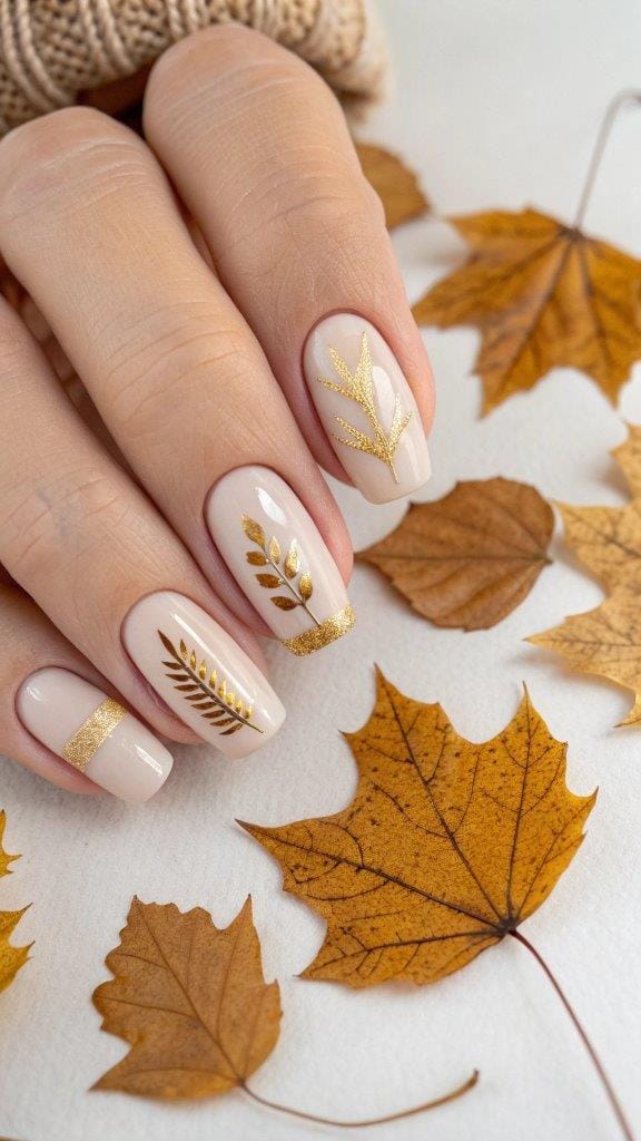 Subtle leaf nail art in gold or copper instantly says, “Yep, it’s fall, baby.”