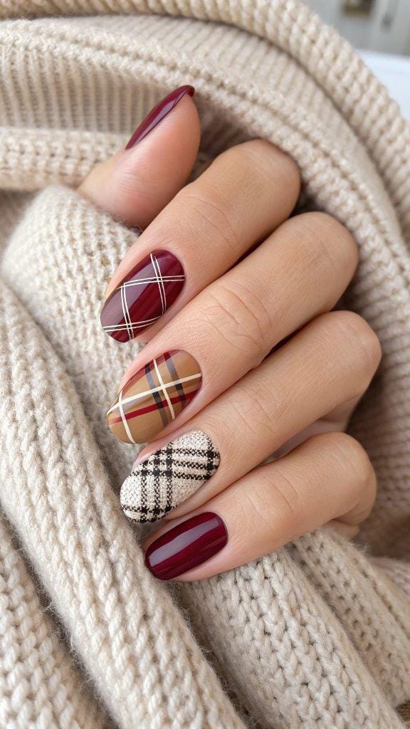 Is it really fall without plaid? A couple of plaid accent nails in warm tones (think camel + burgundy) will instantly upgrade a simple set.