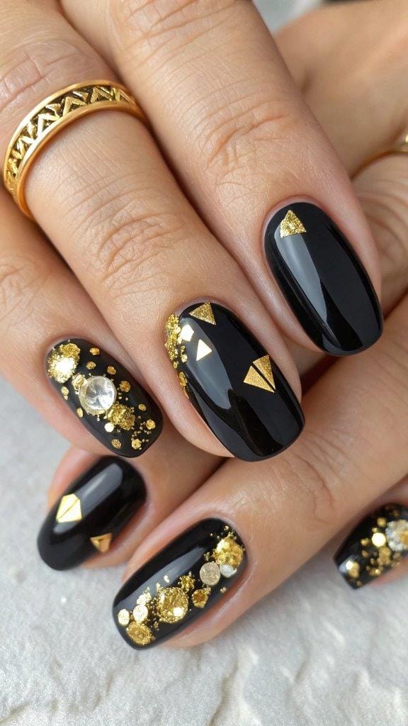 For when you want a little drama: glossy black nails topped with gold foil flakes give rich-girl energy without the actual bank account.