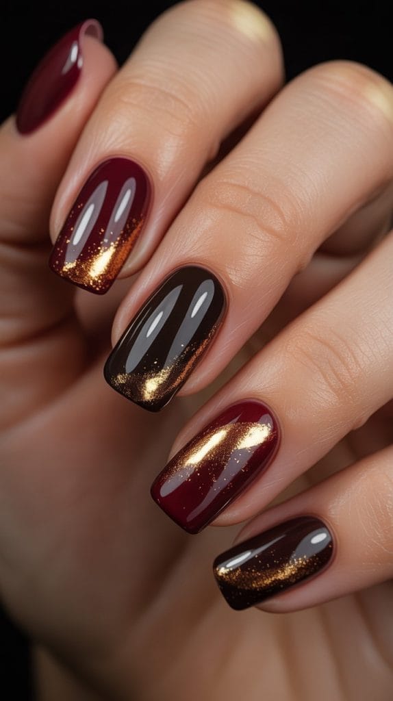 Add a touch of glam to your Thanksgiving style with golden harvest-themed nails. Incorporate gold foil accents or glitter to reflect the abundance of the season. Pair with deep burgundy or rich chocolate hues for a luxurious finish.