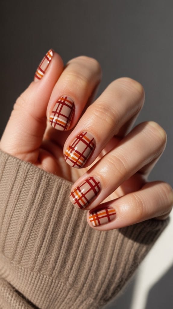 Nothing says fall quite like plaid! Incorporate this classic pattern into your nail design by using thin brushes to create plaid lines over a nude or neutral base. Choose autumnal colors like deep reds, oranges, and browns for a traditional look. Plaid nails are a conversation starter and bring a fun, cozy vibe to any ensemble.