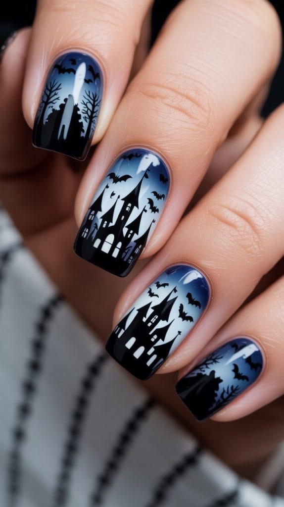 Transform your nails into a spooky haunted house scene. Use a dark blue or black base to represent the night sky and draw silhouettes of haunted houses, complete with eerie windows and ghostly figures. Add some silver or white stars for extra detail. This intricate design tells a spooky story right on your fingertips.