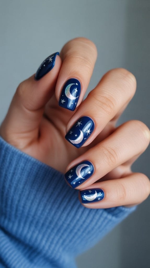 End your spooky nail journey with midnight magic. Use a dark blue or black base and add silver or white stars and moons. Consider using holographic polish for a magical glow. This design captures the enchanting beauty of a starry night and is perfect for those who love a celestial touch to their Halloween nails.