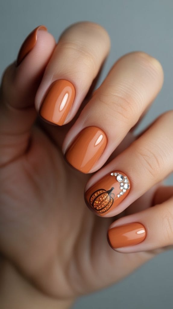 Embrace the pumpkin spice craze with nails that pay homage to everyone’s favorite fall flavor. Think warm orange tones, accented with a touch of cinnamon brown. Add some pumpkin decals or small rhinestones for an extra sparkle. This design is all about warmth and coziness, perfectly complementing your pumpkin spice latte and Thanksgiving festivities.