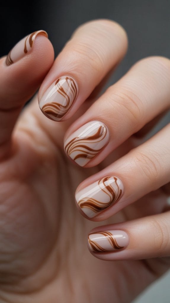 Channel the comforting aroma of cinnamon with nails that feature warm brown tones and swirling patterns. Use a light brown base and add darker swirls to mimic the look of cinnamon sticks. This design is understated yet chic, perfect for those who prefer subtlety with a hint of creativity.