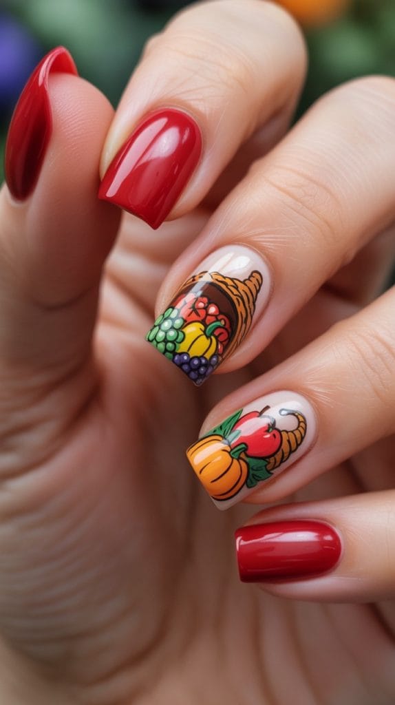 Celebrate the abundance of the harvest with a cornucopia-inspired nail design. Use a variety of fall colors and add elements like fruits and vegetables for a festive look. This design is vibrant and fun, perfect for those who love to embrace the spirit of Thanksgiving.