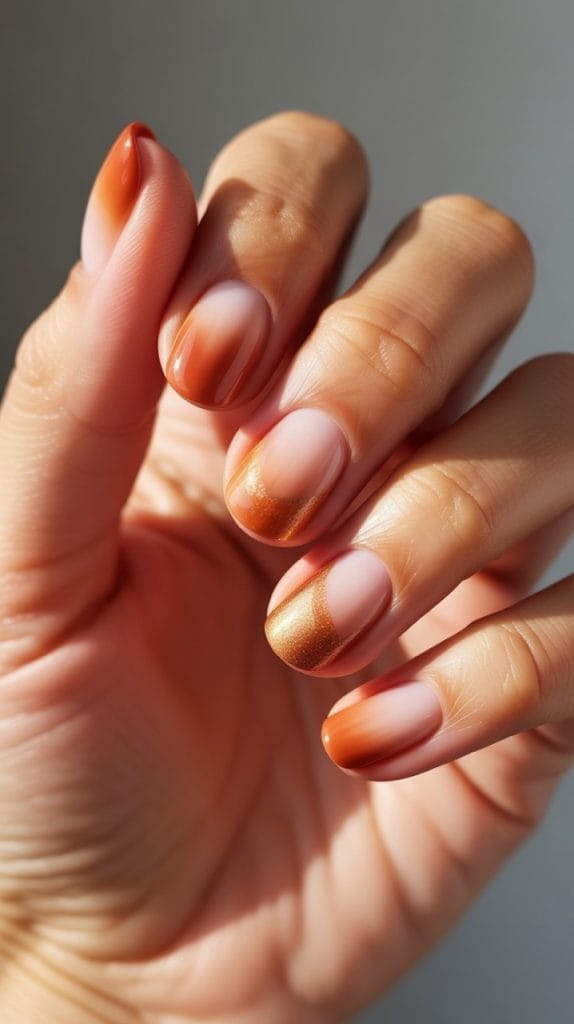 Capture the beauty of a fall sunset with nails in shades of sienna, gold, and pink. Use an ombre technique to blend these colors seamlessly, mimicking the stunning colors of the evening sky. This design is warm and inviting, perfect for a cozy Thanksgiving gathering.